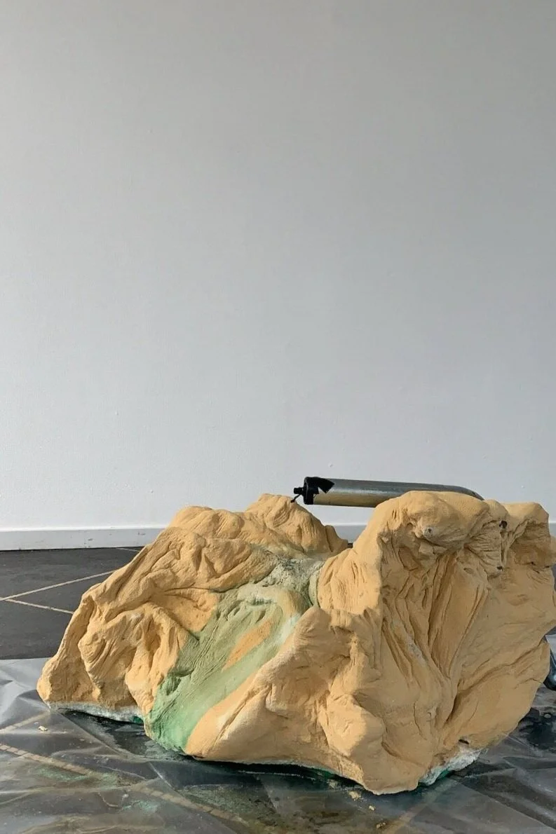 Untitled (A Timeline Starting on the Surface, material world, part 1), 2020-2021, marl, copper oxide, galvanized steel pipes, powder-coated steel, plastic basin, water, plastic bags, soil. 83 x 670 x 195 cm, Detail
